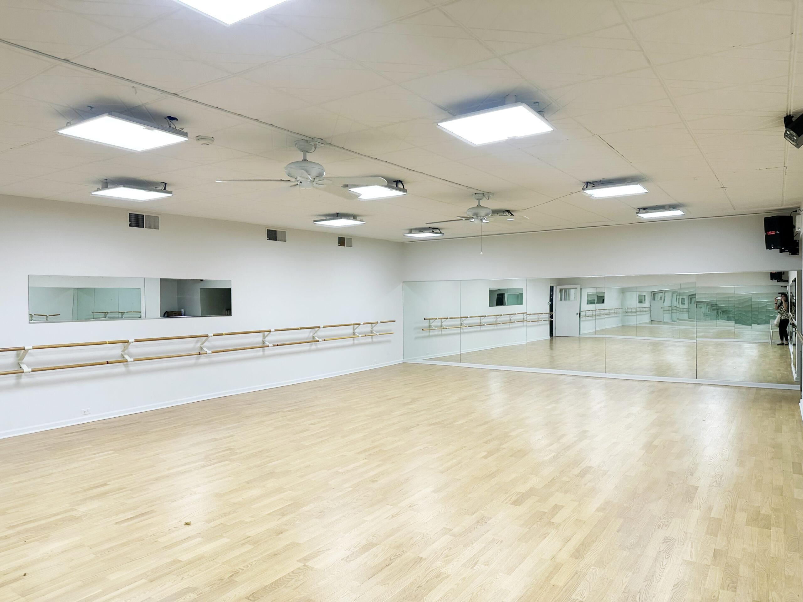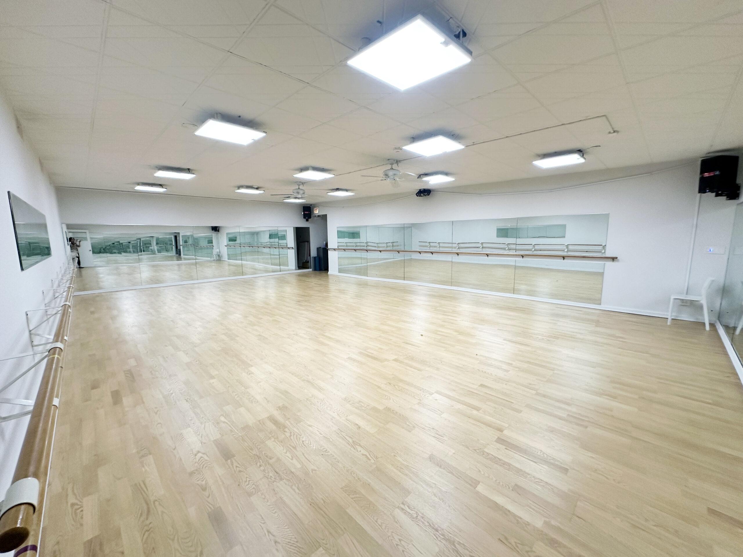 Former dance studio with high ceilings and wood floors. Perfect for yoga, Pilates, personal training, martial arts and fitness, etc.